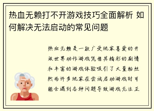 热血无赖打不开游戏技巧全面解析 如何解决无法启动的常见问题
