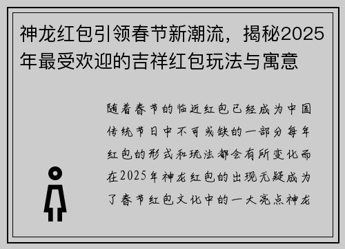 神龙红包引领春节新潮流,揭秘2025年最受欢迎的吉祥红包玩法与寓意