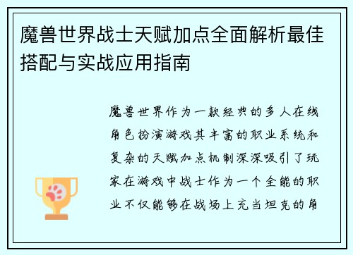 魔兽世界战士天赋加点全面解析最佳搭配与实战应用指南