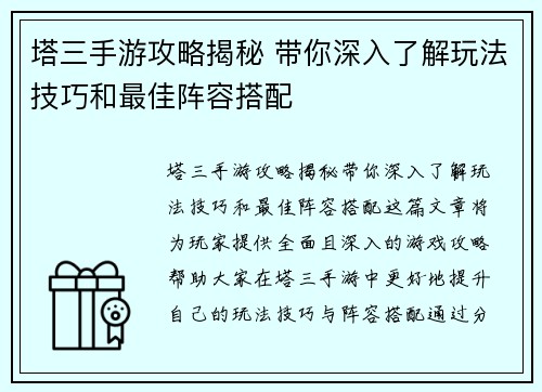塔三手游攻略揭秘 带你深入了解玩法技巧和最佳阵容搭配
