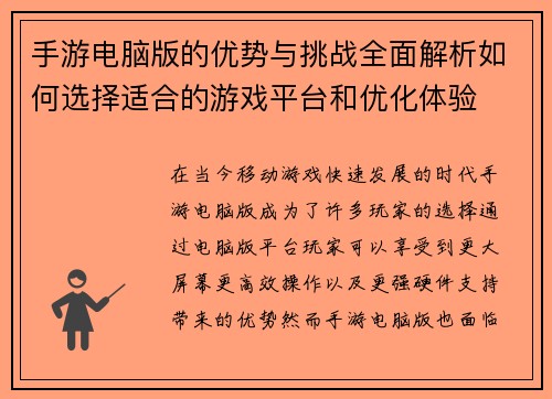 手游电脑版的优势与挑战全面解析如何选择适合的游戏平台和优化体验