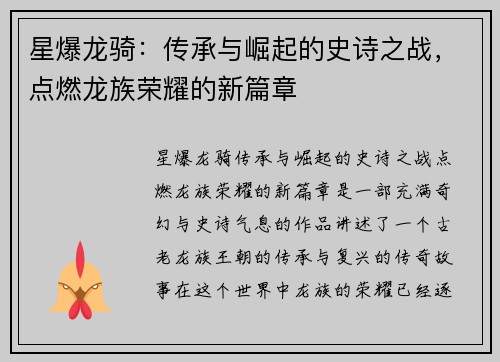 星爆龙骑:传承与崛起的史诗之战,点燃龙族荣耀的新篇章